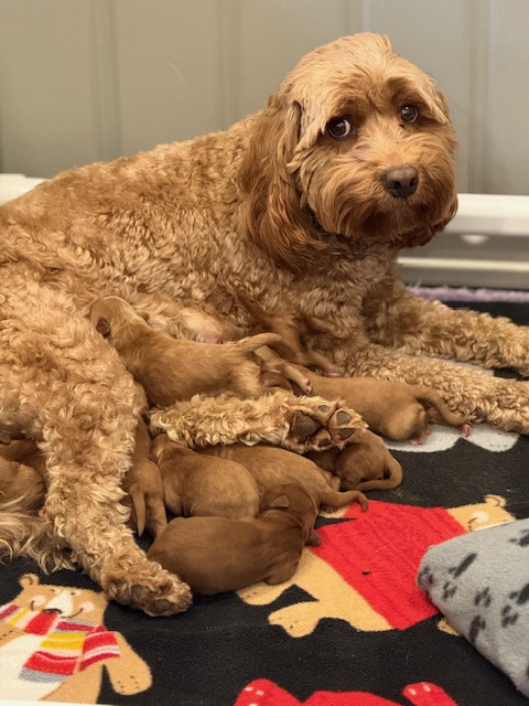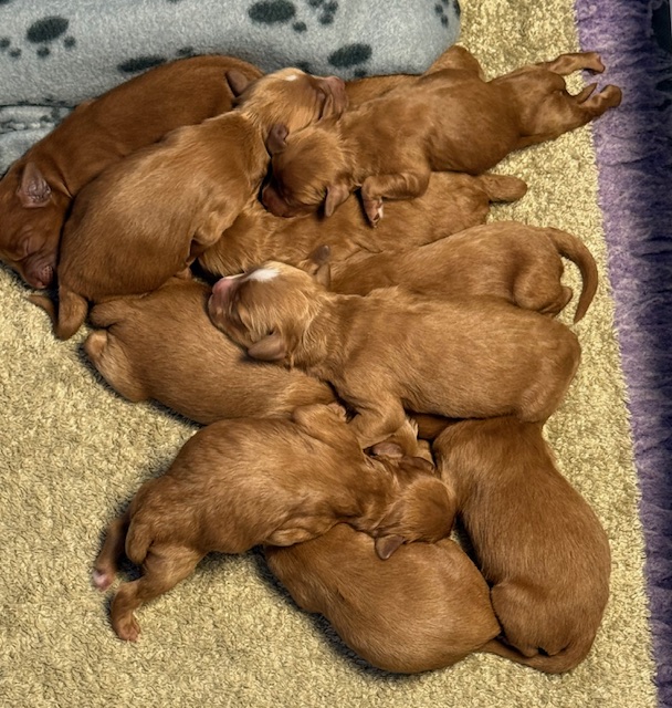 Spring litter: On April 4/26 Indie and Finnick welcomed 11 puppies. We have six girls and five boys in shades of apricot, caramel and red. These puppies will mature from 25-35 lbs. Due to the larger than expected litter size we do have some spaces available. These puppies will be available to go home on May 30th. It is a great litter for those looking to add a summer puppy